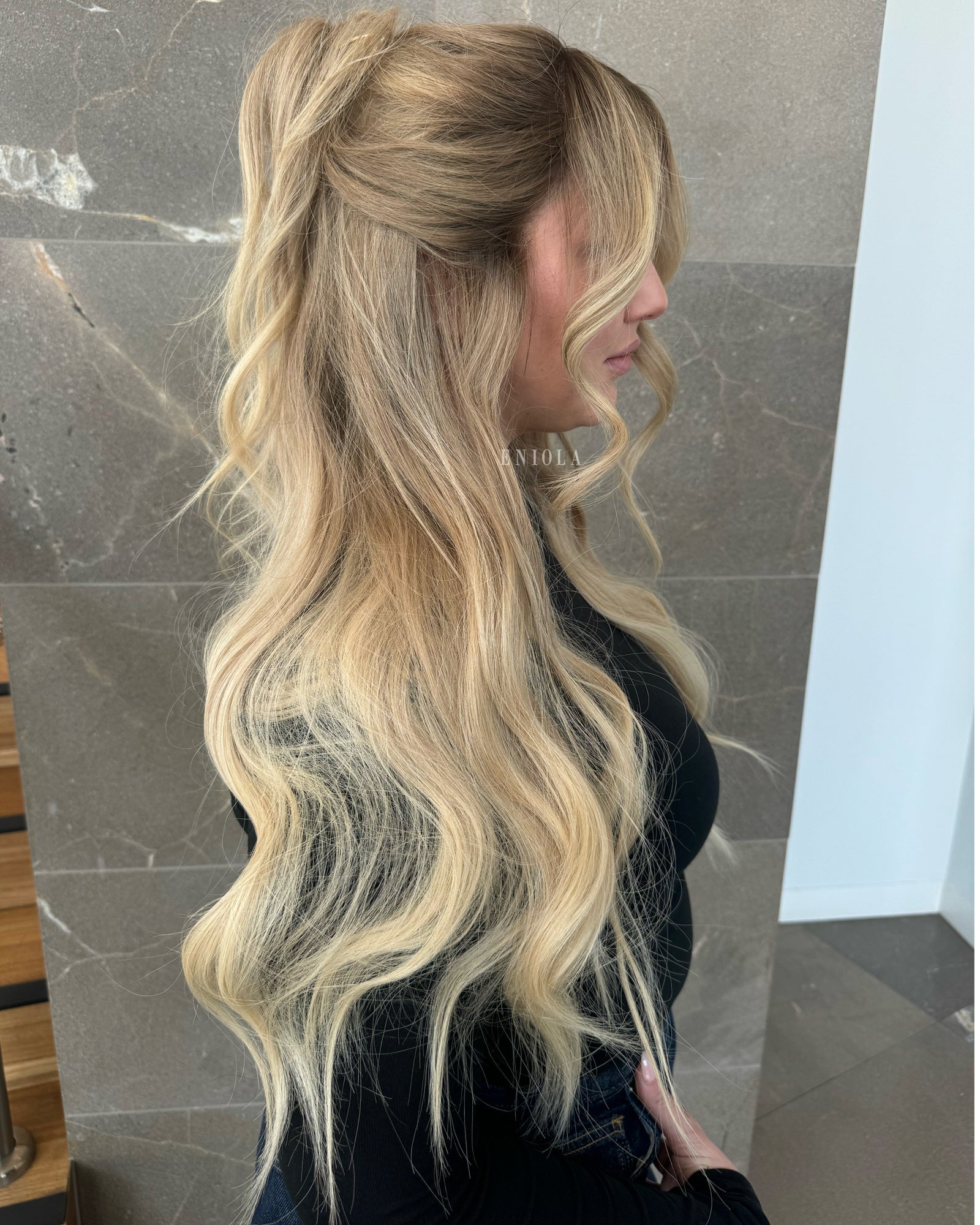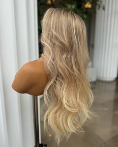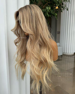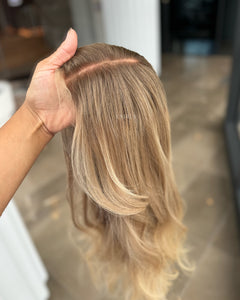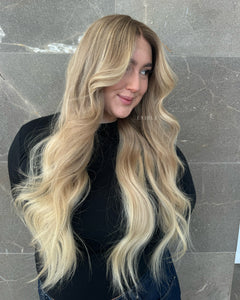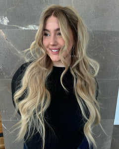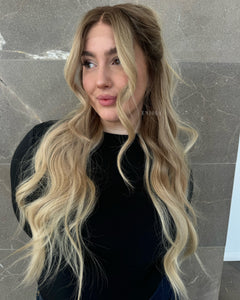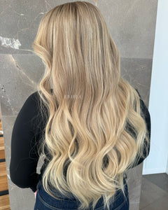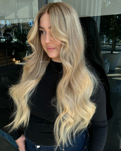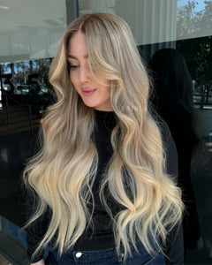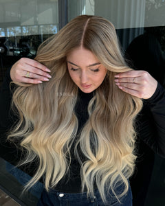 COLOUR: MEDIUM BROWN ROOTS WITH SUN- KISSED VANILLA BLONDE OMBRE